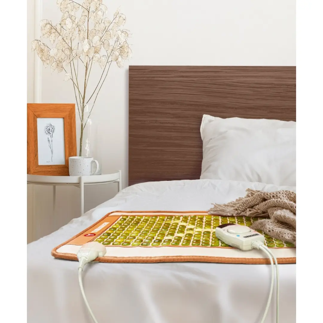 В коврик вшито 242 камня – натурального цельного нефрита. Они закреплены на термостойком арпатеке – искусственном материале, устойчивому к износу и механическим повреждениям. Управление нагревом пользователь осуществляет с помощью пульта, для изготовления которого производитель выбрал прочный и безопасный пластик.